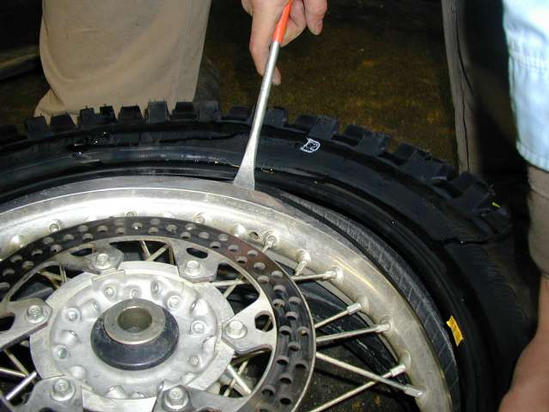 まず、エアバルブをリムの中に押し込めてやり、エアバルブの横から、タイヤレバーを差し込みます。