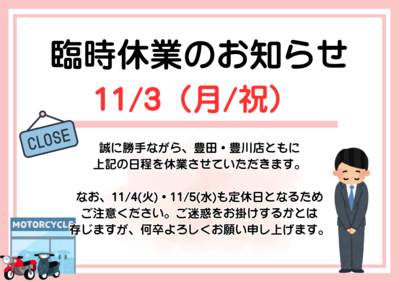 11/3月曜日に臨時休業のお知らせをさせて頂きます。